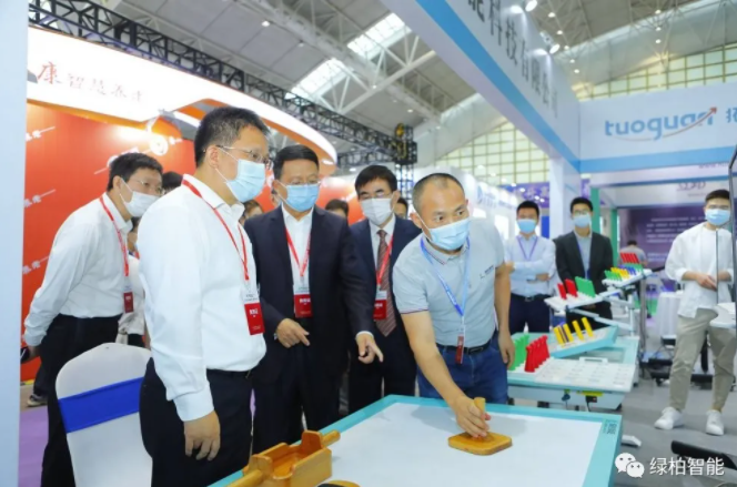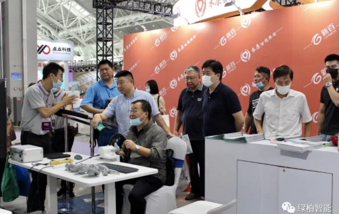 開幕式結束后,省政府副省長趙世勇等一行領導首先來到綠柏展位蒞臨指導。綠柏公司總經理田開江先生為大家介紹了綠柏智能康復產品的特色功能和在養老方面的應用情況。趙副省長親自體驗了智能OT這款產品,并表示把人工智能和傳統康復相結合是非常創新的典范,也是康復養老未來發展的方向。